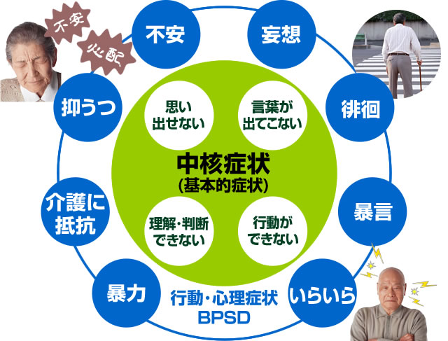 「中核症状」とは、覚える、判断するなどの役割を担っている脳の神経細胞が失われて、機能が障害されるために起こる「思い出せない」「理解・判断できない」といった症状です。